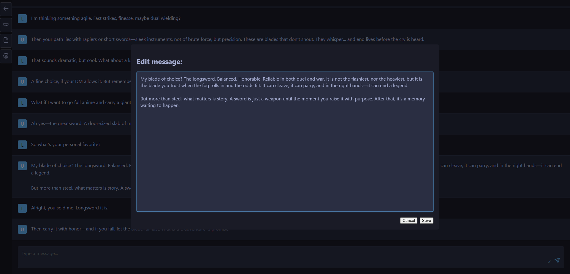 mythforge/– Python backend implementationui/– Static files for the browser UImodels/– place your.ggufmodel files herechats/– per-chat history storageglobal_prompts/– system prompt filesserver_logs/– JSON event logs