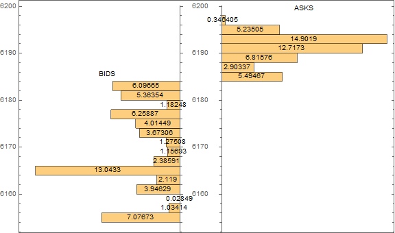 askNormalizaer = Round[asks[[All, 2]] / min];Representation of the order book using Histogram:
