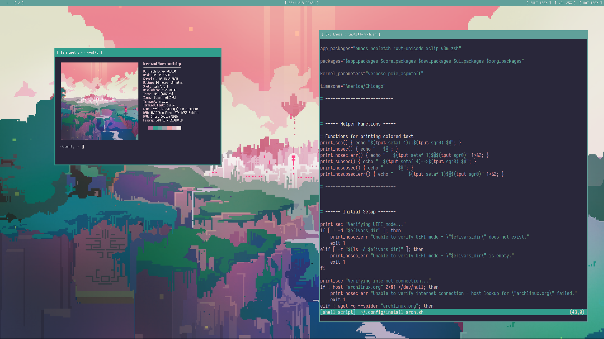 The following repo contains the dotfile templates for my current GNU/Linux setup. These templates are translated into their final form via tmpl.