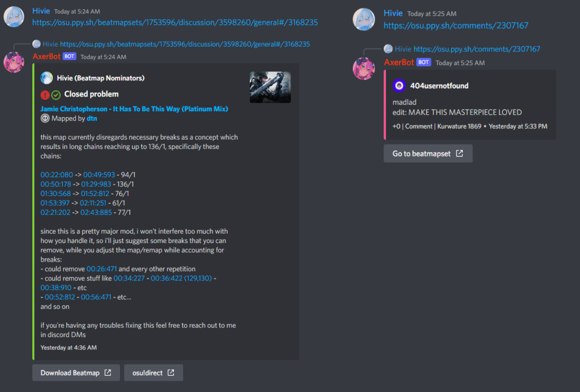- Automatic beatmap discussion and comment embeds