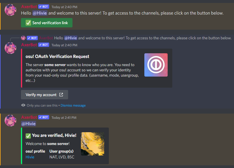 - An OAuth2 verification system where you sign up with your osu! account in order to be granted access to the server, with usergroup-specific role assignments