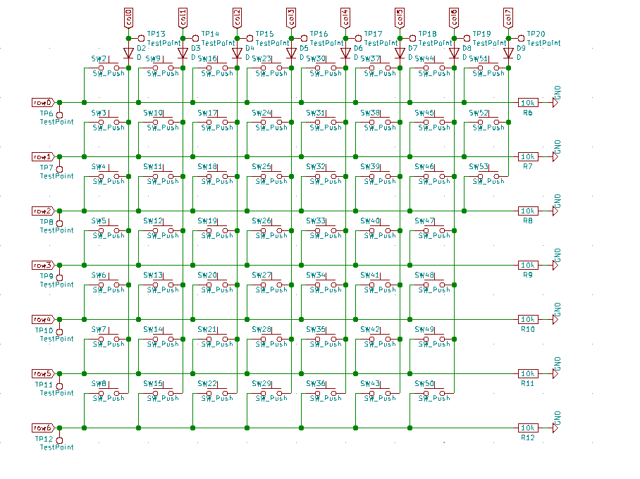 The keys are arranged in a matrix, with a serial-in-parallel-out shift register on the rows, and a parallel-in-serial-out shift register on the columns. The microcontroller polls row and column pairs to detect key presses. Each column has a diode to avoid sinking 3V3 to GND when two buttons in the same row are pressed. In the case of multiple keys presed at once, ghosting will occur since diodes are only placed on a column-basis.