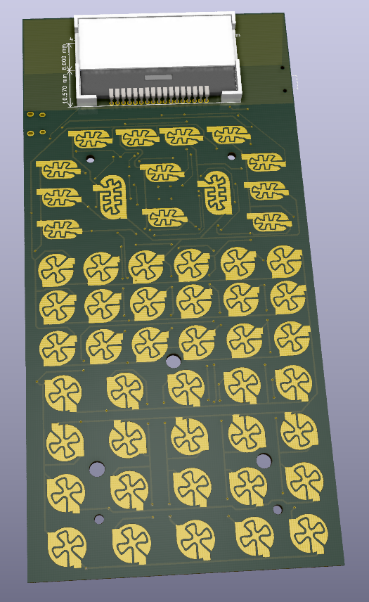 The original calculator uses a carbon-coated silicone pad with carbon contacts on the PCB. This design uses the exact button pad footprint of the original calculator, with copper contacts instead.