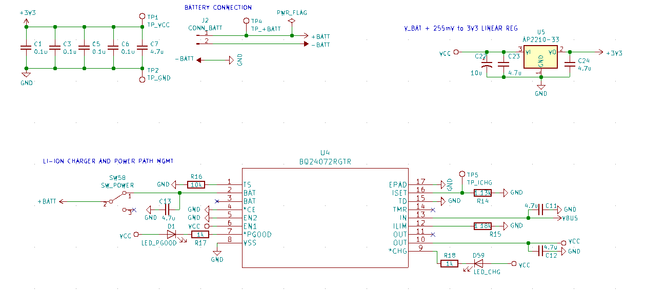 The board is powered by a battery management IC with power path. The IC upregulates the battery voltage to +BATT + 250mV as VCC, where +BATT can vary from 3.0V (depleted) to 4.35V (full). An additional LDO regulates VCC to 3V3, which powers the microcontroller and other circuitry. The LDO has a dropout voltage of +250mV, which means that the battery will still have a bit of power left when it is depleted. The battery management IC actually charges to CV 4.2V, which means it will not charge the battery to full capacity (~80-90%).