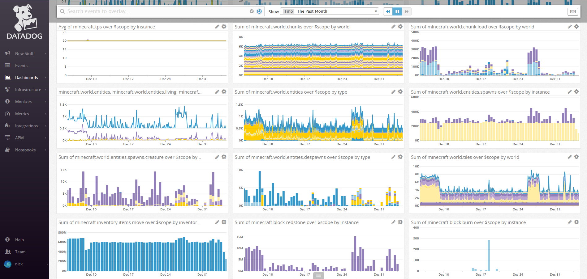 DataMine Collects Minecraft server performance metrics and forwards them to a DogStatsD collector. Check out this Datadog dashboard containing metrics collected from our test network: