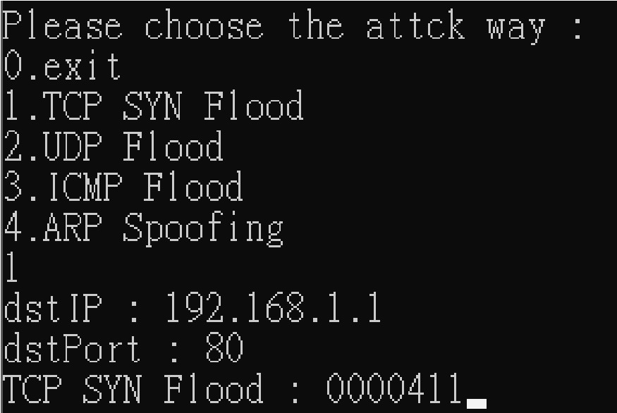 - TCPSYNFloodAttack : TCP SYN packet flood router or victim host