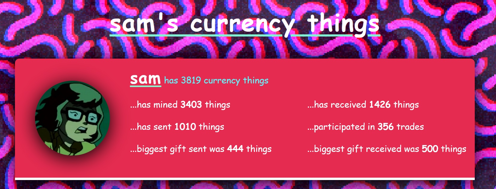 You can click on any user's name in the blockchain to go their Currency Thing page. This displays the same type of information as the homepage, but specific to the current user. User statistics and graphs are updated in real-time.