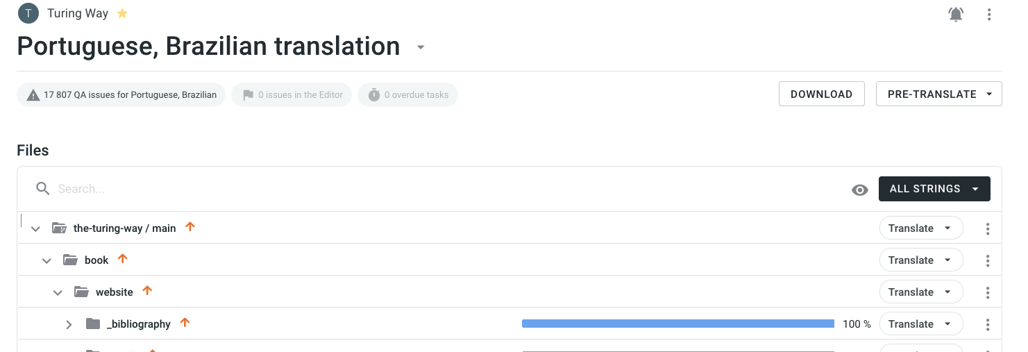 You can browse the content by strings or by files, we recommend browsing it by file so that entire sections of The Turing Way are translated in context.