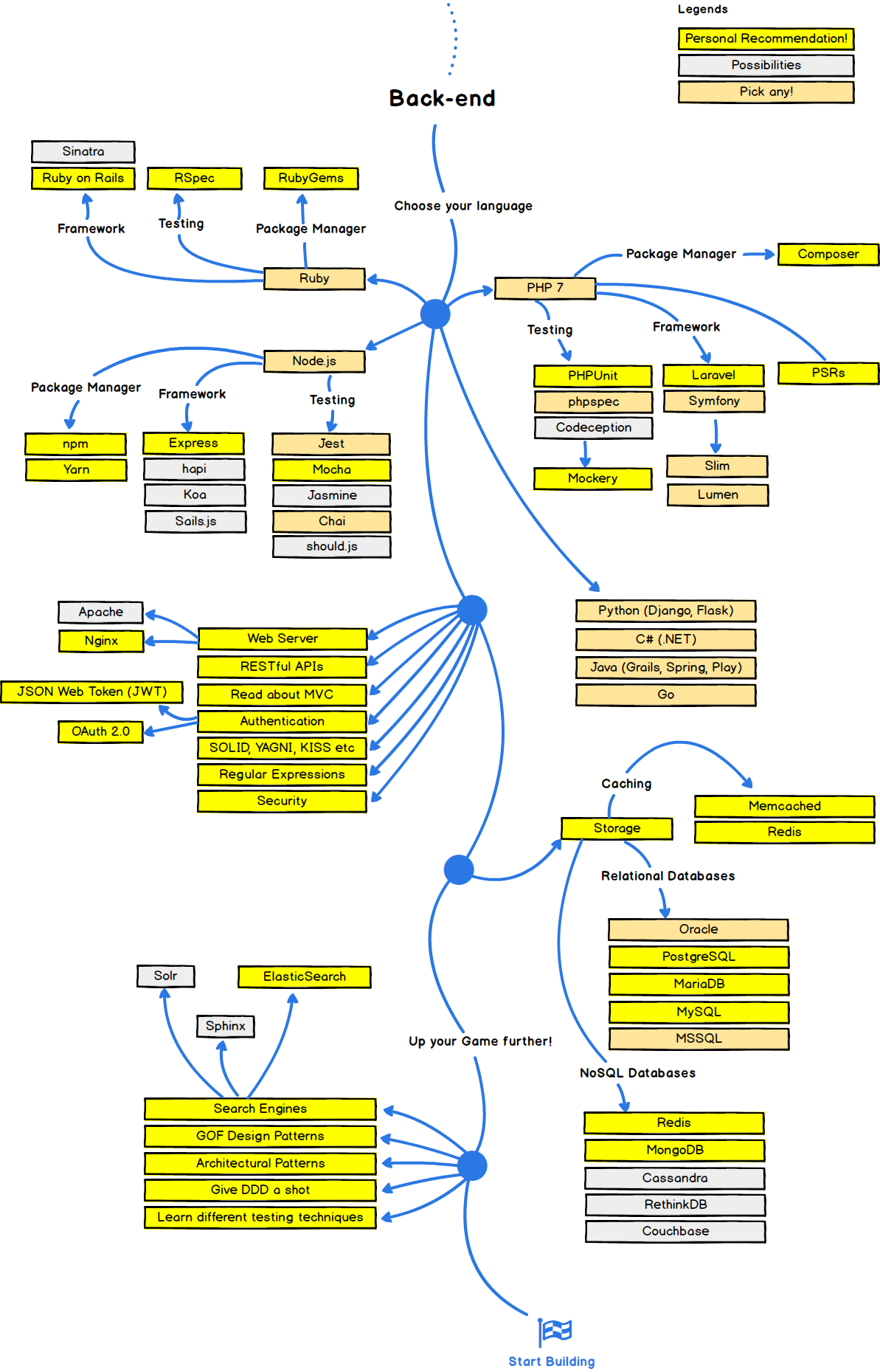 Below you find a set of charts demonstrating the paths that you can take and the technologies that you would want to adopt in order to become a frontend, backend or a devops. I made these charts for an old professor of mine who wanted something to share with his college students to give them a perspective.