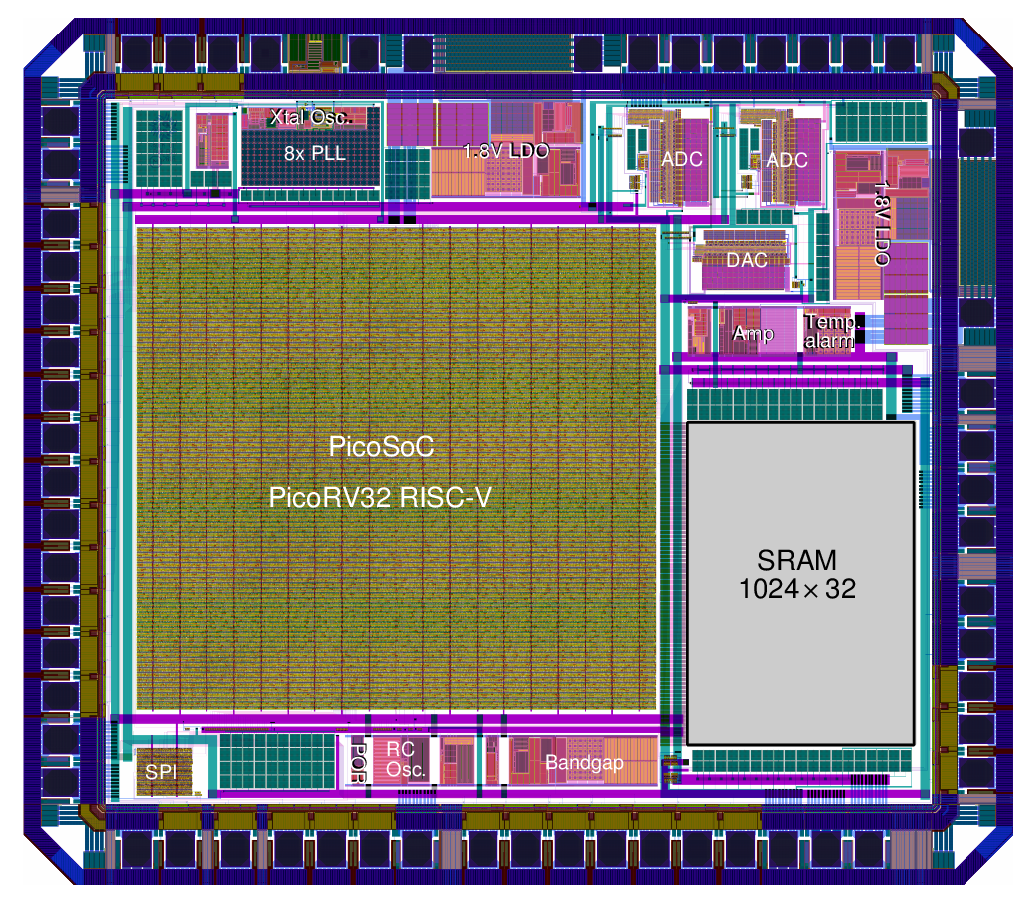 It is an ASIC implementation of the PicoSoC-PicoRV32. The core was previously proven with an FPGA implementation and Raven is the first SoC built with it.The system integrator is Tim Edwards, another champion in the open source domain. Raven includes analog IPs like PLLs (Clock Multipliers), ADCs, DACs comparators and some other blocks as well.Efabless has successfully bench-tested the Raven at 100MHz, and based on simulations the design should be able to operate at up to 150MHz.