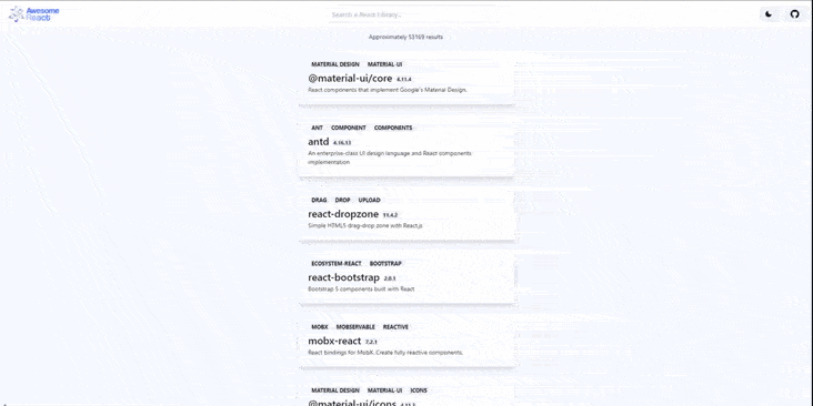 Awesome-React 🔥 A collection of awesome React components and libraries. https://awesome-react.com Demo Contributing Pull requests are welcome. For major changes, please open an issue first to discuss what you would like to change. License MIT