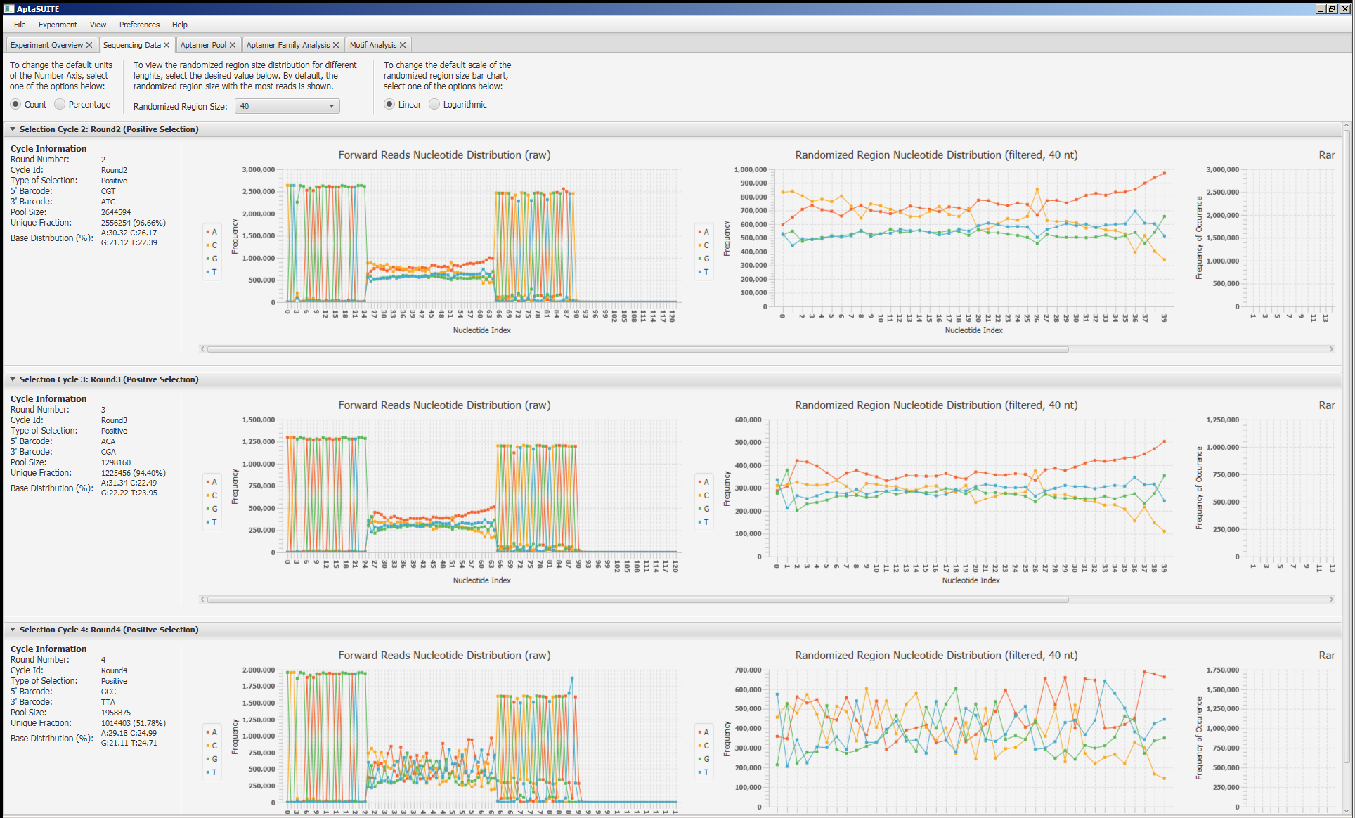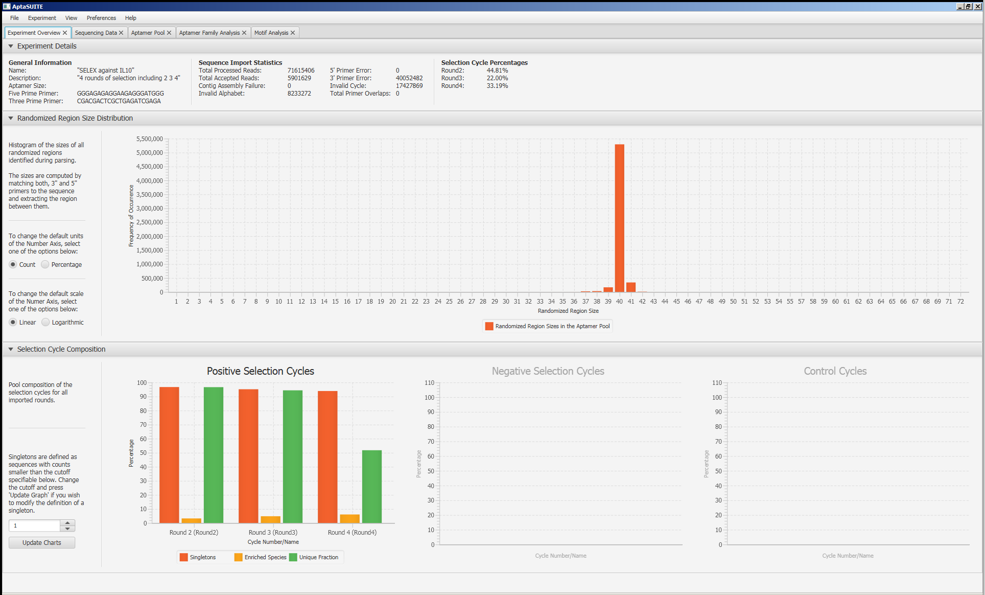 AptaSUITE is a platform independent implementation of multiple algorithms designed for the identification of aptamer candidate sequences and the analysis of the SELEX process per se.