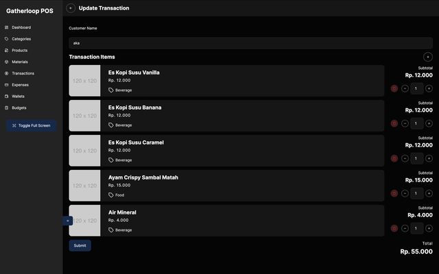Menu Management: Register and update new menu items seamlessly. Transaction Processing: Record customer transactions efficiently. Automated Calculations: Automatically calculate costs and profits for each transaction. Financial Management: Streamline operations by automating budget allocations for operational expenses, food costs, and profits. This POS system aims to provide a comprehensive solution for managing business operations more efficiently, reducing manual work and improving financial transparency.