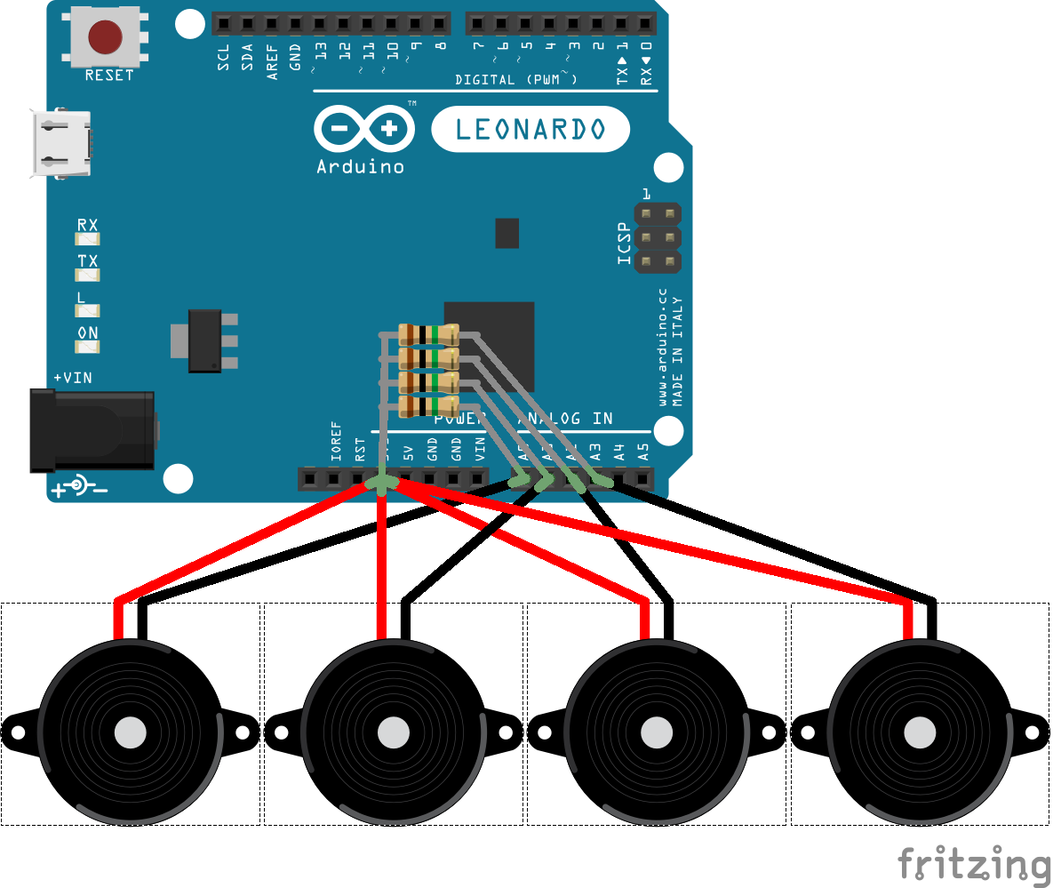 To set up the circuit, you need an Arduino Leonardo, a set of four piezo sensors, and four 1MΩ resistors for some special cases.