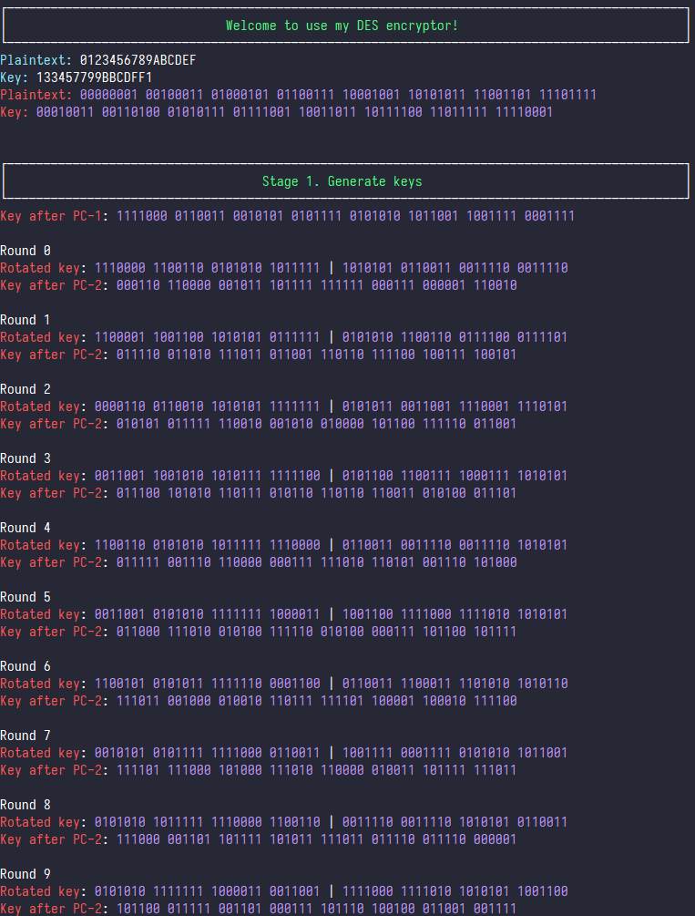 My DES Demo A DES demo program, with detailed computation process. Requirements This project relies on the rich library. Use the following command to install requirements: pip install rich