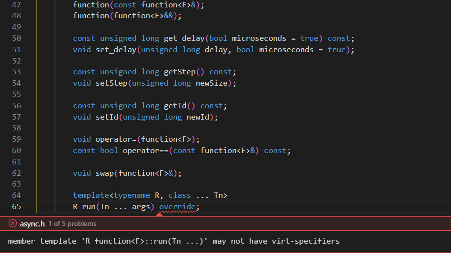 src/async.h:65:28: error: member template 'R function::run(Tn ...)' may not have virt-specifiers