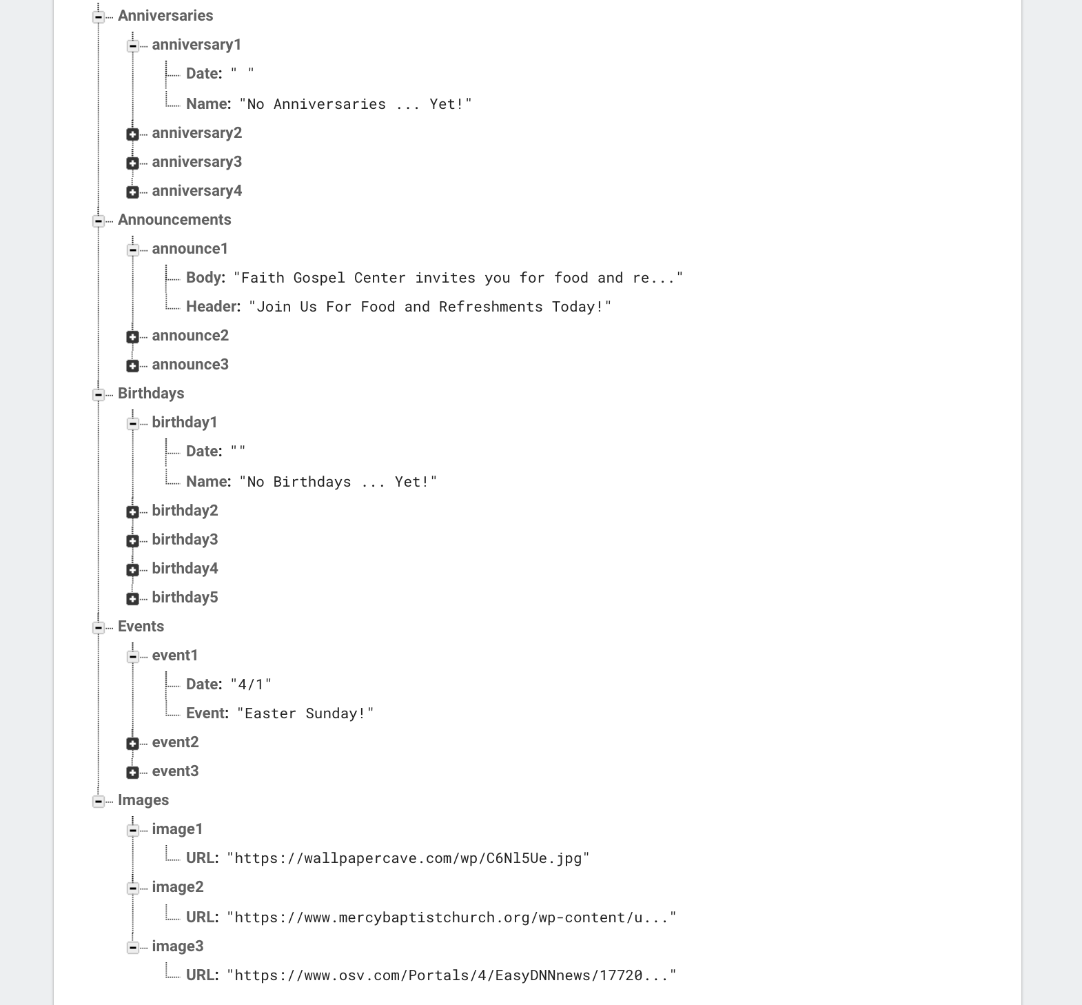 An example of my digital signage used for a lobby display at a church while using the Google Firebase API to have a live announcement/event feed.
