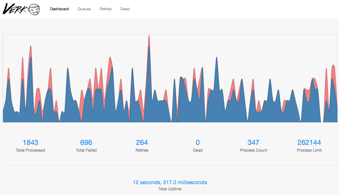 Verk.add_queue(:new, 10) # Adds a queue named `new` with 10 workersVerk.remove_queue(:new) # Terminate and delete the queue named `new`Verk's goal is to never have a job that exists only in memory. It uses Redis as the single source of truth to retry and track jobs that were being processed if some crash happened.