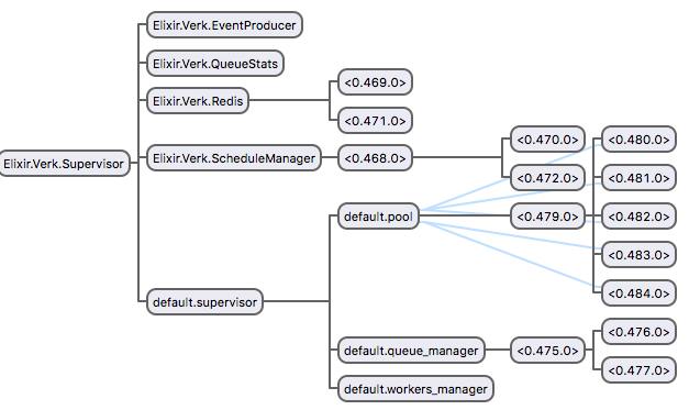The image below is an overview of Verk's supervision tree running with a queue named default having 5 workers.