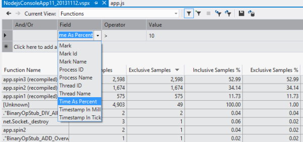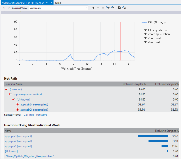 Node.js Tools for Visual Studio takes advantage of V8 Profiling API's as well Visual Studio's Reporting features to give you a sense of where your program is spending its time. Here's a short program to illustrate:
