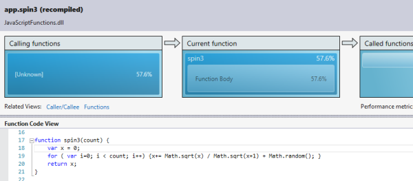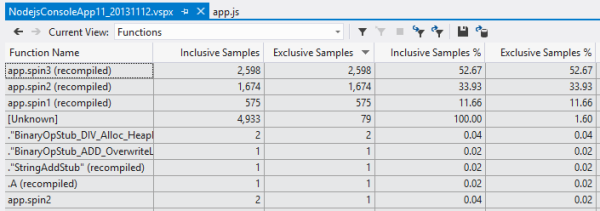 A useful initial view is “Functions”. Here we see the three spin functions displayed. If the functions called other function, you'd see the Inclusive/Exclusive amounts displayed as well (but see warning below):