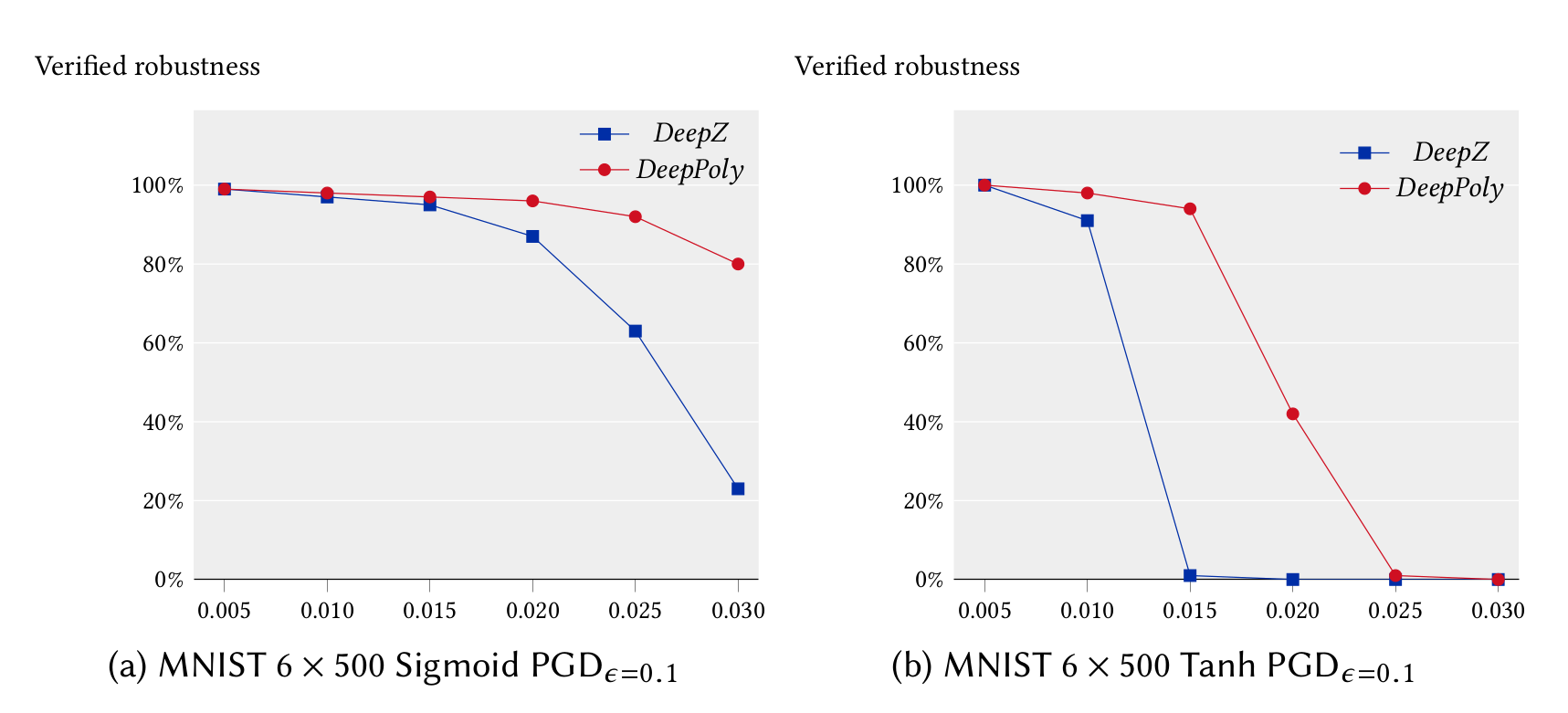 We ran our experiments for the feedforward networks on a 3.3 GHz 10 core Intel i9-7900X Skylake CPU with a main memory of 64 GB whereas our experiments for the convolutional networks were run on a 2.6 GHz 14 core Intel Xeon CPU E5-2690 with 512 GB of main memory. We first compare the precision and performance of DeepZ and DeepPoly vs Fast-Lin on the MNIST 6x100 network in single threaded mode. It can be seen that DeepZ has the same precision as Fast-Lin whereas DeepPoly is more precise while also being faster.
