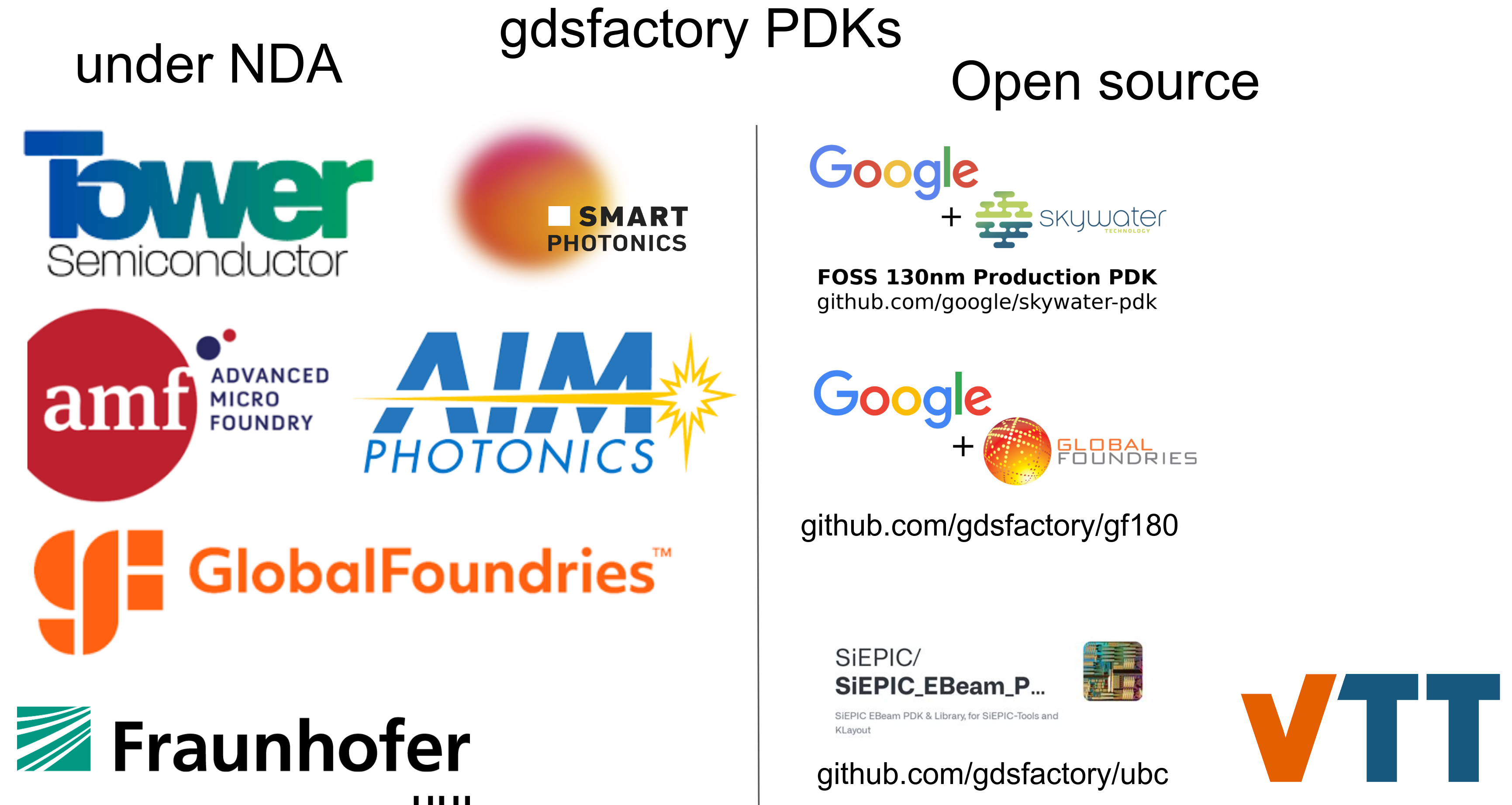 Numerous foundries have gdsfactory PDKs available. You may need to contact your foundry to access their gdsfactory PDK, as some are provided under NDA only.