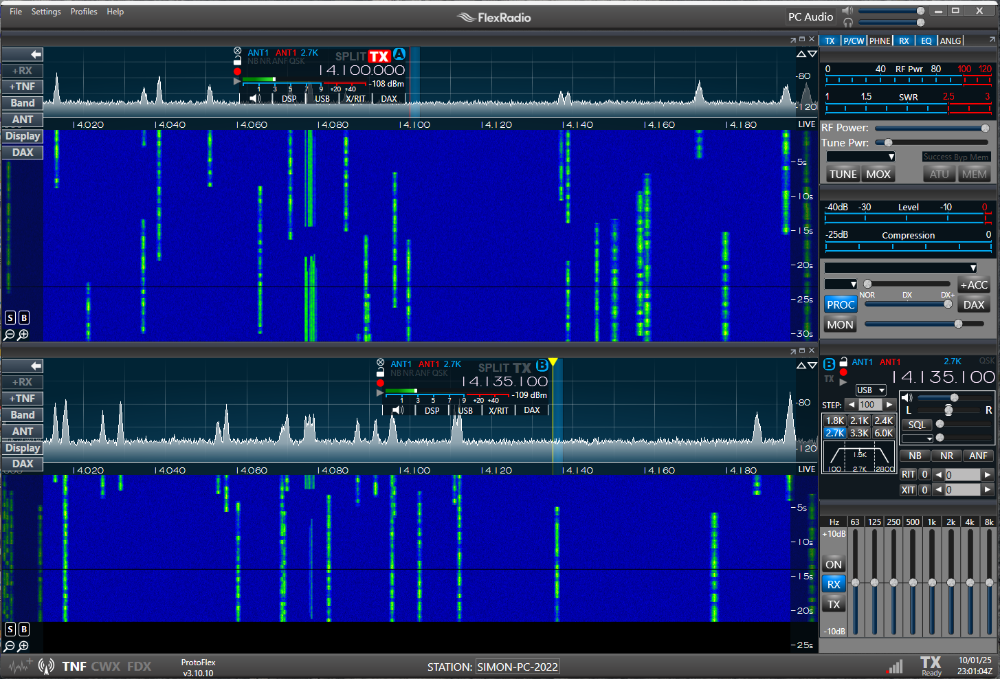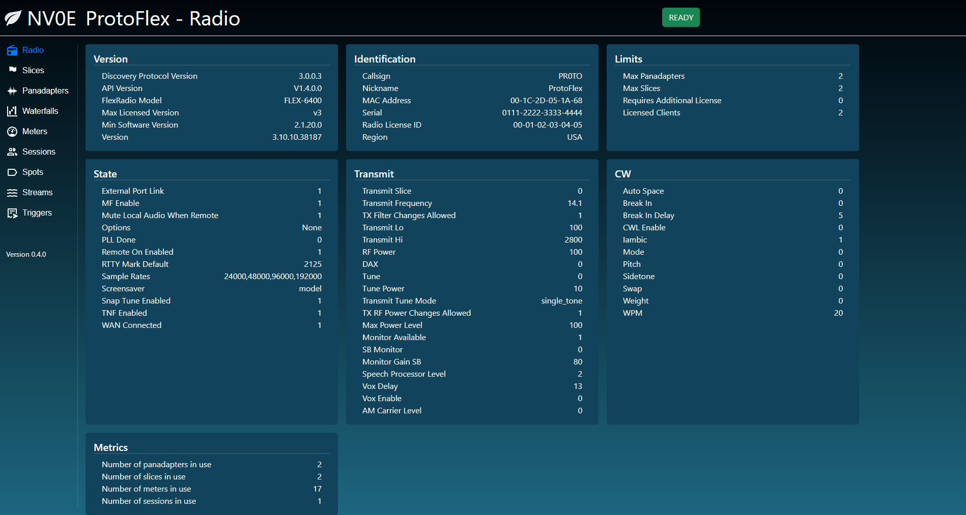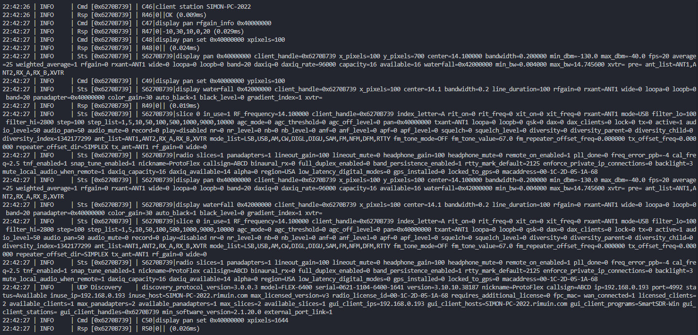 Beyond its initial scope, ProtoFlex supports scenarios such as simulating multiple FlexRadios on a network. ProtoFlex also emulates multiple panadapters and receive slices. Each panadapter includes an independent Spectrum Generator that approximates RF signals and noise, offering a realistic backdrop for client-side signal visualization and interaction.