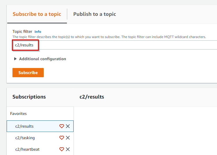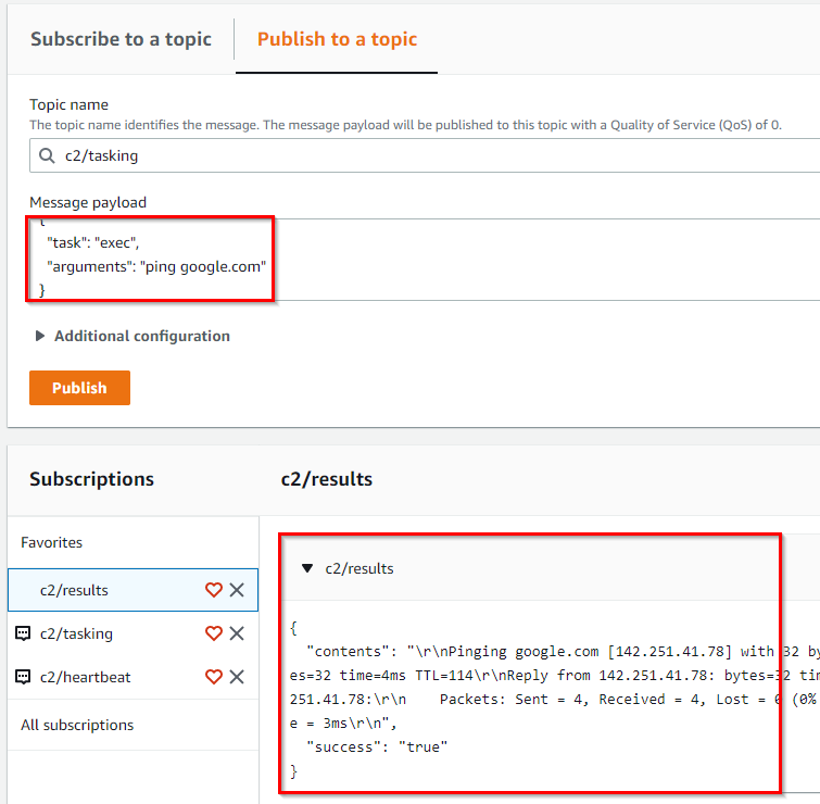 The implant has been configured with very basic functionality to demonstrate the usage of MQTT for C2 and integration with AWS IoT Core. For simplicity, interaction with the implant by an operator is primarily done through the MQTT test client in the AWS IoT Core console page.