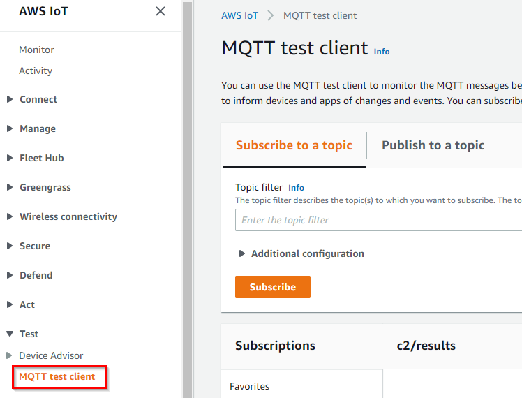 c2/resultsas a topic and click "Subscribe". Note thatc2/resultsappears under the "Subscriptions" window. - Repeat the above step for the