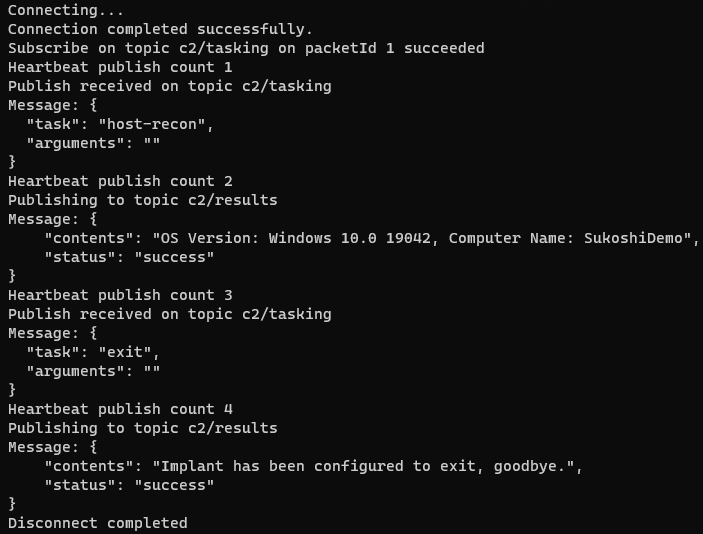 c2/taskingtopic in "Subscriptions" - Observe the implant receiving the task, performing the work and publishing results. The following sample is from the Python build: