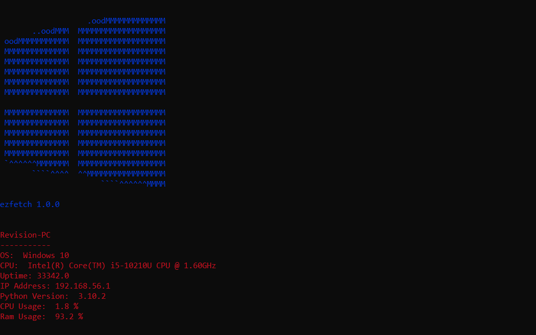 ## git clone this repogitclonehttps://github.com/sssain/ezfetch## install all dependencies using requirements.txt providedpip3install-rrequirements.txt## run ezfetchpyezfetch.py