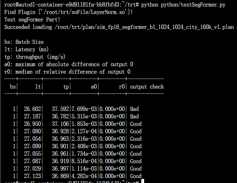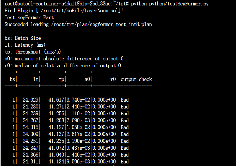 - 我们构建的int8 engine with partial LayerNormPlugin在batch_size=1,图片大小为1024x1024时24ms可以完成推理,但是相对误差(分类错误的像素点占总像素点的比例)在1e-2级别,这个误差对语义分割来说是一个不可用的状态(几乎全错)。